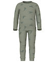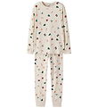 Natblusen har en rund halsudskæring med trykknapper ved venstre skulder og lange ærmer. Natbukserne har en elastisk talje, som kan justeres med knapper indvendigt. I benåbningerne er der ribkanter.