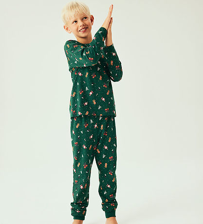 Charmerende Name It nattøj 2-delt i en dyb grøn farve med søde prints af juleelementer. Nattøjet har lange ærmer og bukser, perfekt til hyggelige nætter.