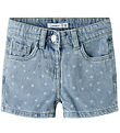 Name It shortsene har korte ben og en praktisk elastikkant i taljen med dekorative bindebånd. Shortsene har to åbne lommer i siderne fortil.