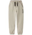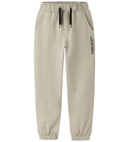 Stilfulde Name It sweatpants i en lys beige nuance med teksten "School Society" diskret trykt langs benet. Name It har designet sweatpantsene med en elastisk talje, som justeres indvendigt med knapper og en dekotrativ snørre i livet. Modellen har elastik ved anklerne for en god pasform, og praktiske sidelommer til småting. Bagpå findes en snydelomme.