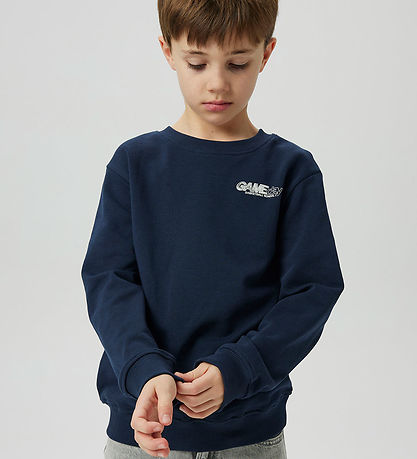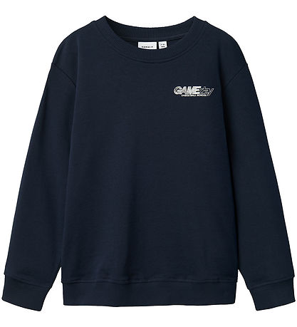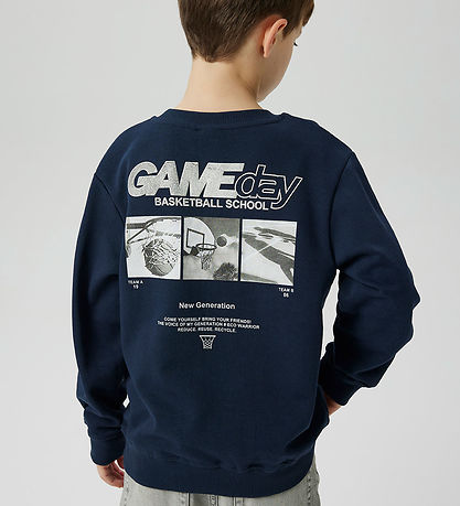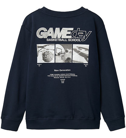 Stilren Name It sweatshirt i en dyb navy nuance med et lille trendy sportprint på fronten. Bagpå har sweatshirten et stort sportsprint af basketball motiver og teksten "GameDay Basketball School". Et alsidigt valg fra Name It til den unge garderobe.