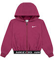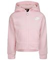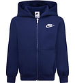 Nike cardiganen har en fast hætte og lange ærmer. I krops- og armåbningerne er der brede ribkanter, og på maven er der en delt kængurulomme. Cardiganen åbnes med en gennemgående lynlås og den har blød, børstet bomuld på indersiden.