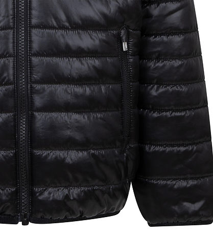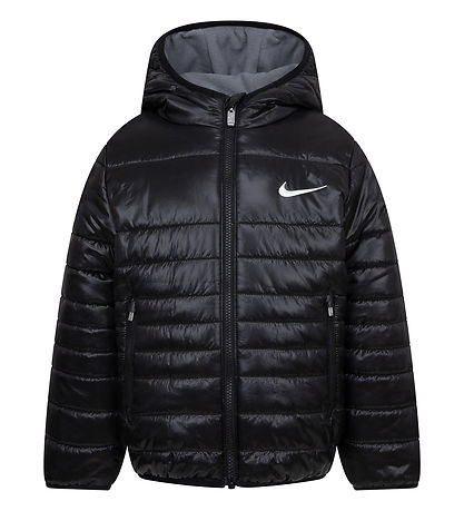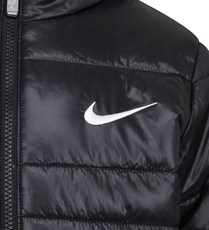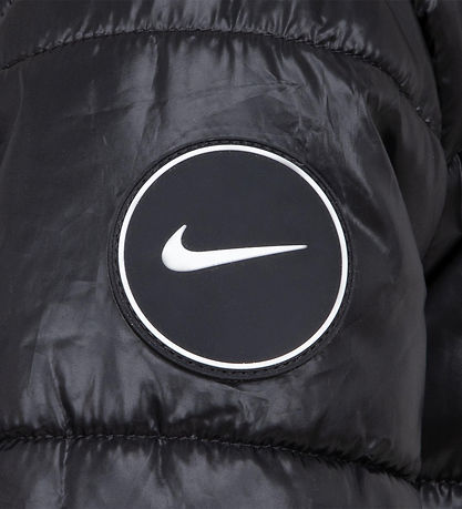 Sej Nike dynejakke i skinnende sort med et hvidt, broderet logo på venstre bryst og et hvidt gummilogo på venstre overarm. Dynejakken er med vandrette syninger.