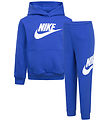 Nike hættetrøjen har en fast hætte, og den har brede ribkanter. Fortil sidder der en stor, firkantet kængurulomme. Sweatpantsene har lange ben med brede ribkanter, og i livet er der en bred elastikkant. Sweatsættet har blødt, børstet bomuld på indersiden.