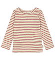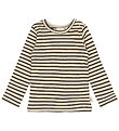 Attraktiv Petit Piao bluse med lange ærmer i beige med mørkegrønne striber og med en flot ribstruktur. Blusen har en rund halsudskæring og trykknaplukning på den ene skulder, der gør den nem at tage på og af. Petit Piao skaber produkter med detaljer, der gør hverdagen lettere.