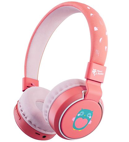 Smarte Planet Buddies høretelefoner i rosa med et print af en blå ugle på ydersiden af ørepuderne. På remmen er der et print af forskellige blade i hvid.