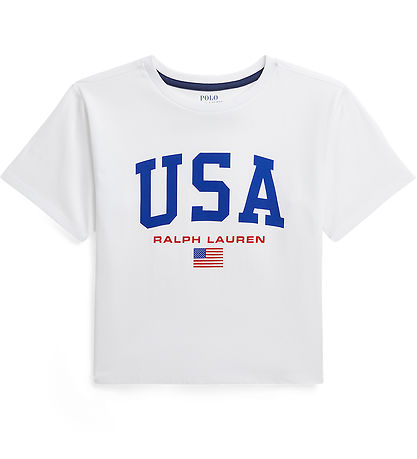 Sej Polo Ralph Lauren t-shirt i hvid, og fortil står der "USA" med store, blå bogstaver og navnet "Ralph Lauren" i rød nedenunder sammen med det amerikanske flag.