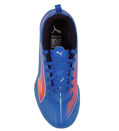 Seje Puma indendørssko i en klar blå farve med orange og hvide detaljer og logoer.