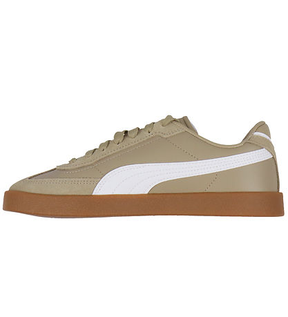 Stilfulde Puma sko i elegant beige læder og ruskind med et klassisk hvidt logo på begge sider og med små logoer i guld.