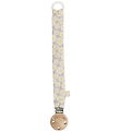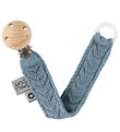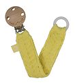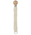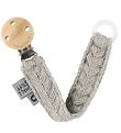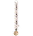 Smallstuff suttesnoren har en rund knop af lyst træ i den ene ende med en klemme på bagsiden, og i den anden side sidder der en silikonering, som kan sættes omkring en sut.