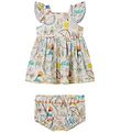 Fin Stella McCartney Kids kjole i hvid med en netstruktur, og fortil er der en kniplet en stor sommerfugl i grøn, gammelrosa og gul. Indenunder er der en gul kjole.