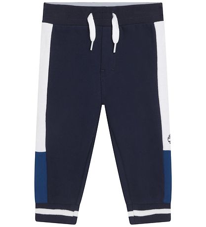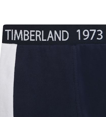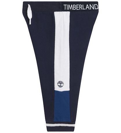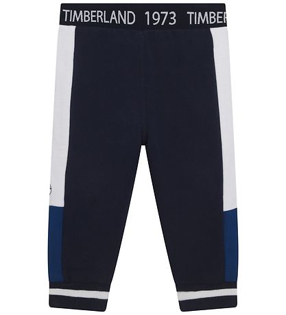 Smarte Timberland sweatpants i navy med blå og hvide detaljer samt mærkets logo på venstre ben. I livet er der en elastik bag, hvor der står "Timberland 1973" i hvid.