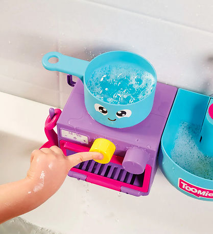 Farverigt Toomies badelegetøj der består af en ovn med drejeknapper, en gryde, en ske og en håndvask.